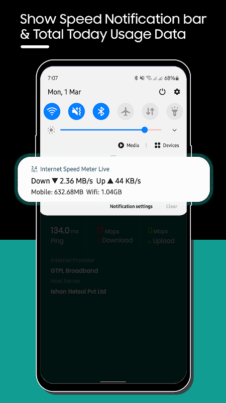 اسٹیٹس بار، نوٹیفکیشن بار اور لاک اسکرین میں لائیو ڈاؤن لوڈ اور اپ لوڈ کی رفتار