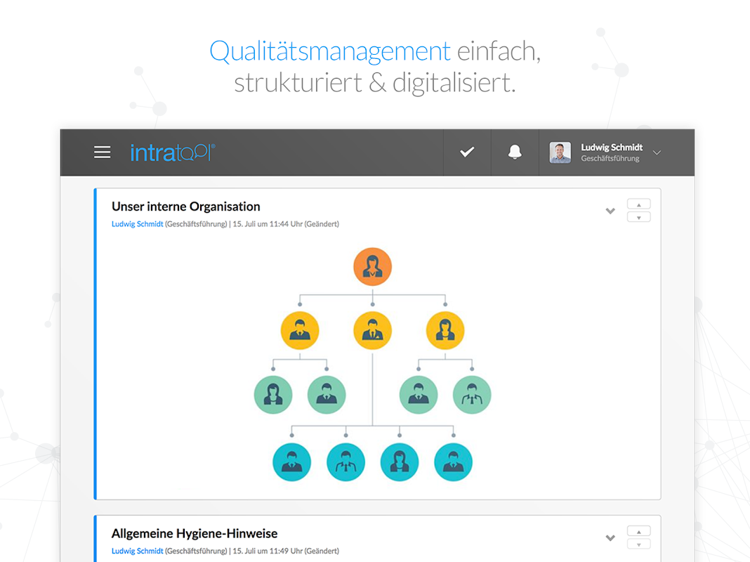 Mit intratool haben Sie alle Aufgaben und deren Status Ihrer Mitarbeiter immer aktuell im Blick. Stellen Sie sich übersichtliche Berichte mit ein paar Klicks über Checklisten, Kennzahlen uvm. zusammen. Informieren Sie Ihre Mitarbeiter schnell und präzise über Neuigkeiten und bieten Sie Ihnen eine Plattform, wo alle wichtigen Handbücher, Verordnungen, Inhaltsstoffe etc. immer aktuell verfügbar sind.
