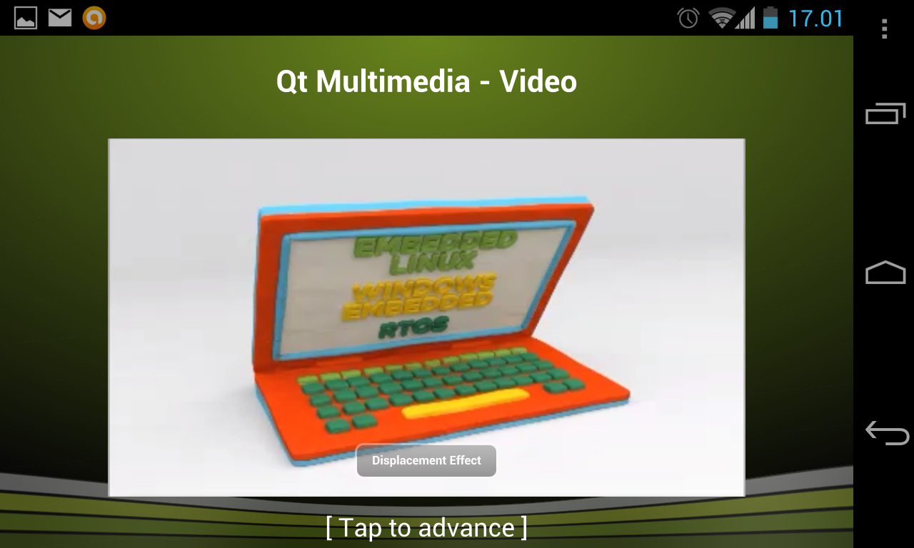 This is a cross-platform Qt Quick 2 application which has been compiled for Android using Qt 5. It describes and demonstrates just some of the power of Qt 5.