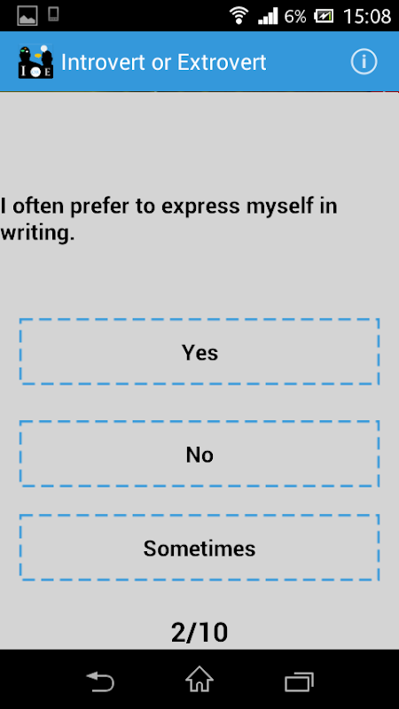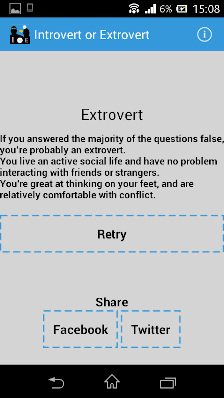 Know easily whether you’re an introvert or an extrovert by downloading this simple app. Let your character speak greatly of you. Find out if your feelings are drawn inwards or if you’re more of an outward person. It’s fun to know. And it’s exciting to know more about yourself.