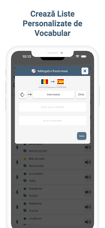 ہماری ایپ خاص طور پر رومانیہ بولنے والوں کے لیے بنائی گئی ہے، جو رومانیہ میں ترجمے، وضاحتیں اور مثالیں فراہم کرتی ہے تاکہ آپ کو ہسپانوی تصورات کو آسانی سے سمجھنے میں مدد ملے۔ یہ دونوں زبانوں کے درمیان فرق پیدا کرتا ہے، سیکھنے کے ایک ہموار تجربے کو یقینی بناتا ہے۔