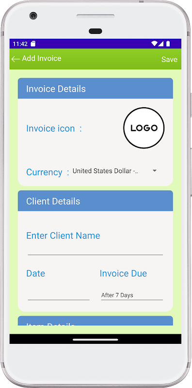 یہ ایپ کاروبار کو مختلف فائل فارمیٹس میں انوائس بنانے کی اجازت دیتی ہے۔ اس میں ورڈ فائل فارمیٹ میں انوائس ٹیمپلیٹ ، خالی انوائس ٹیمپلیٹ فارمیٹ ، آسانی سے استعمال کے قابل ایکسل فائل فارمیٹ انوائس ٹیمپلیٹ ، پی ڈی ایف فائل فارمیٹ میں سادہ انوائس ٹیمپلیٹ ، اور ایکسل فائل فارمیٹ میں ڈاؤن لوڈ کے قابل انوائس ٹیمپلیٹ جیسے متعدد مفت انوائس ٹیمپلیٹس ہیں۔