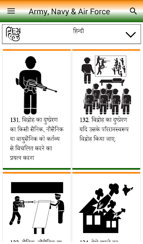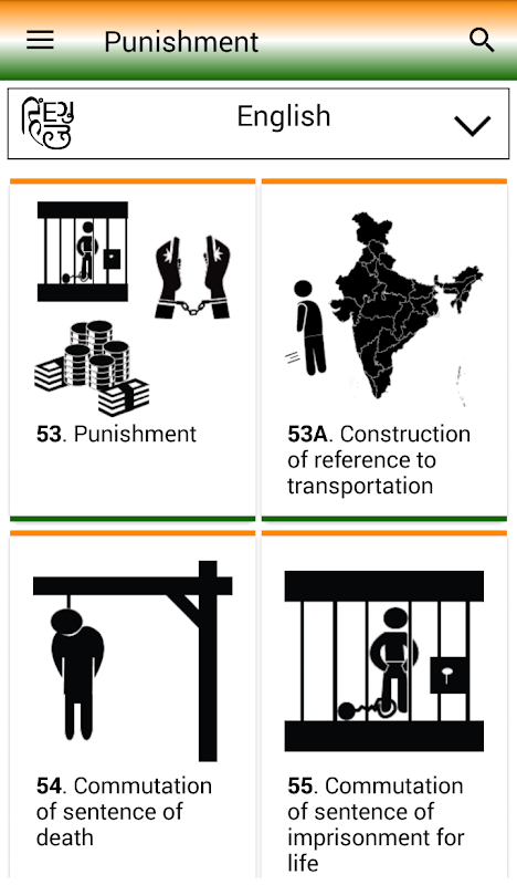 The app acknowledge about Indian Penal Code (IPC) 1860 in different Languages with pictorial action. The app consists of act title in various Languages :