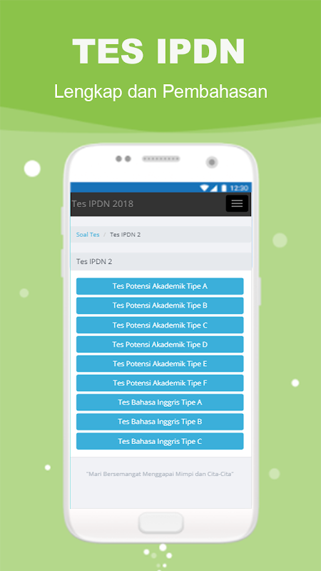 The IPDN SPCP questions are packaged attractively in an android educational quiz-based media interactive platform to prepare high school / MA students and even SMK / MAK Indonesia in participating in the SPDN IPDN Praja Candidate Selection