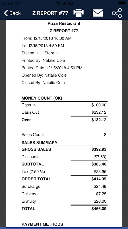 شفٹ کا اختتام: سیلز کے اعداد و شمار کے بارے میں معلومات دکھاتا ہے جیسے: سیلز کاؤنٹ، گراس سیلز، ٹوٹل، اوسط آرڈر۔