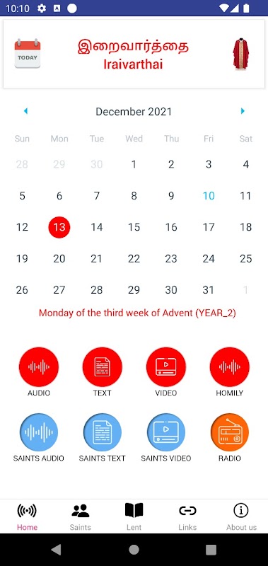 دوسرا آپشن لیٹورجیکل کیلنڈر ہے۔ موجودہ مہینے کا کیلنڈر دیا گیا ہے۔ کیلنڈر میں liturgical معلومات پر مشتمل ہے جیسے liturgical season (ایڈونٹ ، کرسمس سیزن ، عام وقت ، لینٹ اور ایسٹر سیزن) اور یہ سنتوں کے بارے میں بھی تفصیلات فراہم کرتا ہے۔ اور اضافی عام ہولی ڈے۔