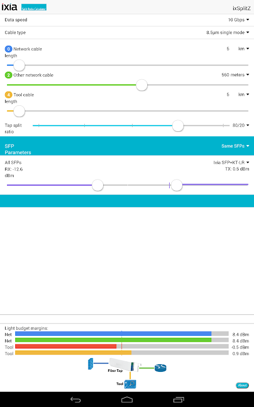 Select your link speed and cable type, and use the top three sliders to enter your cable lengths. The badges on the left pop up a dialog that you can use to enter the number of additional splices (i.e., patch panels, add +1 for each mated connector pair) in each cable. Each splice adds -0.5dBm for multimode, -0.2dBm for single mode. (The endpoint connections are already factored in, so the badge should read 0 if the cable connects the endpoints directly.) Use the fourth slider to change the tap’s split ratio and watch how it affects the light budget margins at the four endpoints.