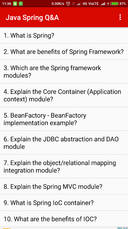 اس ایپ نے تقریبا 50+ جاوا اسپرنگ انٹرویو سوالات کا احاطہ کیا ہے اور اس کے جوابات ہیں۔