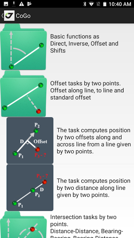 کوآرڈینیٹ جیومیٹری (CoGo) ٹولز آپ کو فیلڈ میں حساب کتاب کرنے کے سروے کے کاموں کا حساب لگانے دیتے ہیں، جیسے فارورڈ اور انورس ٹاسکس، انٹرسیکشنز، ڈیوائیڈ لائن، ایریا/پریمیٹر/ والیوم کمپیوٹیشن وغیرہ۔