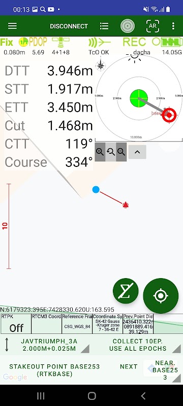 RTK سروے ٹول آپ کو ریڈیو ٹرانسمیشنز (FH، UHF یا RCV) کا استعمال کرتے ہوئے NTRIP، RCV یا کسی بیس سے تصحیح حاصل کرتے ہوئے وصول کنندہ کو روور کے طور پر ترتیب دے کر اپنے Android™ ڈیوائس کے ساتھ RTK سروے کرنے اور اسٹیک آؤٹ کرنے کی اجازت دیتا ہے۔