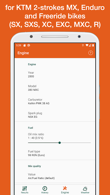 یہ ایپ درجہ حرارت، اونچائی، نمی، ماحول کے دباؤ اور آپ کے انجن کی ترتیب کو زیادہ سے زیادہ جیٹنگ (کاربوریٹر کنفیگریشن) اور اسپارک پلگ کو KTM 2-اسٹروک MX، Enduro اور Freeride بائیکس (SX، SXS، XC، XC-W) کے لیے استعمال کر رہی ہے۔ ، EXC، MXC، R ماڈلز)۔