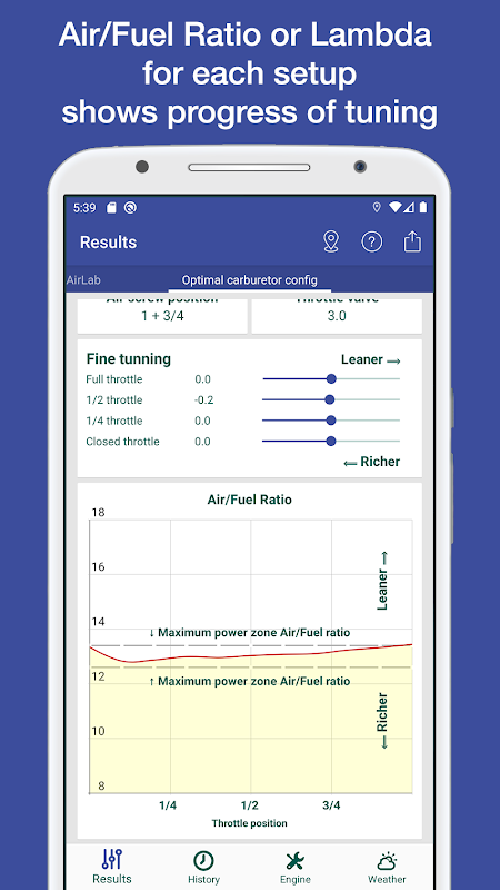 • تاریخ: یہ ٹیب تمام کاربوریٹر سیٹ اپ کی تاریخ پر مشتمل ہے۔ اگر آپ موسم، یا انجن سیٹ اپ، یا ٹھیک ٹیوننگ تبدیل کرتے ہیں، تو نیا سیٹ اپ تاریخ میں محفوظ ہو جائے گا۔