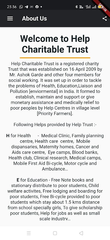 Help Charitable Trust is a registered charity Trust that was established on 16 April 2009 by Mr. Ashok Garde and other four members for social working. It was set up in order to tackle the problems of Health, Education,Liaison and Pollution [enviormental] in India. It formed to establish, maintain and support or give monetary assistance and medically relief to poor peoples by Help Centres in village level [Priority Farmers].