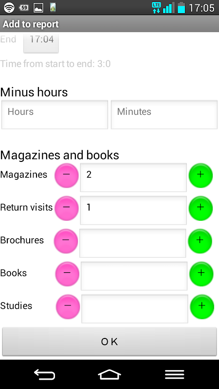 You can count preach times on timer or can input direct time.After the preach,you input result,magazines,brochures,books,return visits and studies. And it can automatically calculate the total of the month.