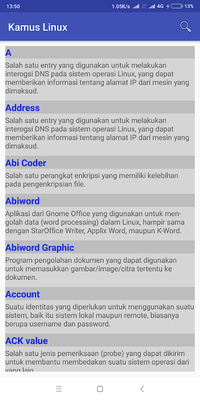 Kamus Linux merupakan aplikasi berbasis mobile yang berisi tentang istilah-istilah mengenai sistem operasi Linux dan hal-hal lain yang terkait mengenai Linux.