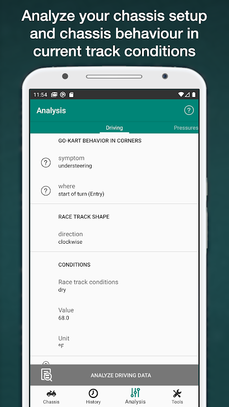 - ڈرائیونگ تجزیہ: آپ کو اس بارے میں مطلع کرنا پڑے گا کہ ڈرائیور کونوں میں کارٹ کے رویے کو کیسا محسوس کرتا ہے۔ سیکشن "کونوں میں برتاؤ" میں اس بارے میں معلومات درج کریں کہ ڈرائیور گو کارٹ چیسس کے رویے کے بارے میں کیا محسوس کر رہا ہے (مثال کے طور پر - کونوں میں داخل ہونے پر انڈر اسٹیئرنگ)۔ یہ سب سے اہم معلومات ہیں جو ایپ کے ذریعے مشورے کا حساب لگانے کے لیے استعمال کی جاتی ہیں۔ آپ کو ریس ٹریک (گھڑی کی سمت یا مخالف گھڑی کی سمت)، موجودہ موسم اور ریس ٹریک کے حالات (انٹرنیٹ کے ذریعے خودکار موسم کا پتہ لگانے) کے بارے میں بھی معلومات درج کرنی چاہیے۔ تمام عناصر کو حساب کے لیے مدنظر رکھا جا رہا ہے۔