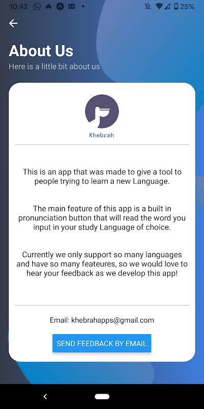 ہم ابھی بھی بڑھ رہے ہیں اور دوسری زبان سیکھنے والوں کے ل this اس ایپ میں مزید خصوصیات شامل کرنے کے ل looking تلاش کر رہے ہیں۔ ہمیں خصوصیت کی درخواست / آراء / زبان کی تجاویز بھیجنے کے لئے آزاد محسوس کریں اور ہم یہ دیکھنا پسند کریں گے کہ ہم اس ایپ کو کس طرح بہتر بنا سکتے ہیں۔