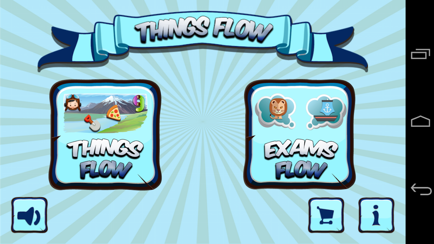 "Things Flow" gives an opportunity to pre-school children to learn new information and develop their mental and cognitive skills with two options. The first option, "Things Flow", offers to learn pronunciation of the objects that was vocalized by professional artists; the second option is "Exams Flow" offers a test that designed pre-school children, so they can evaluate their gainings.