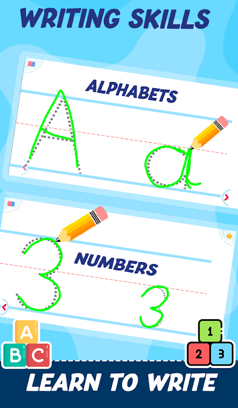 بچوں کے لیے انگریزی پڑھانے میں حروف اور نمبر لکھنے کی خصوصیت بھی شامل ہے تاکہ بچے کو لکھنے کے ساتھ ساتھ پڑھنا سیکھنے میں آسانی ہو۔ رنگ، ہندسی اشکال، جانوروں کے نام، جانوروں کی آوازیں اور بہت سی الفاظ بھی سکھانا نہ بھولیں۔