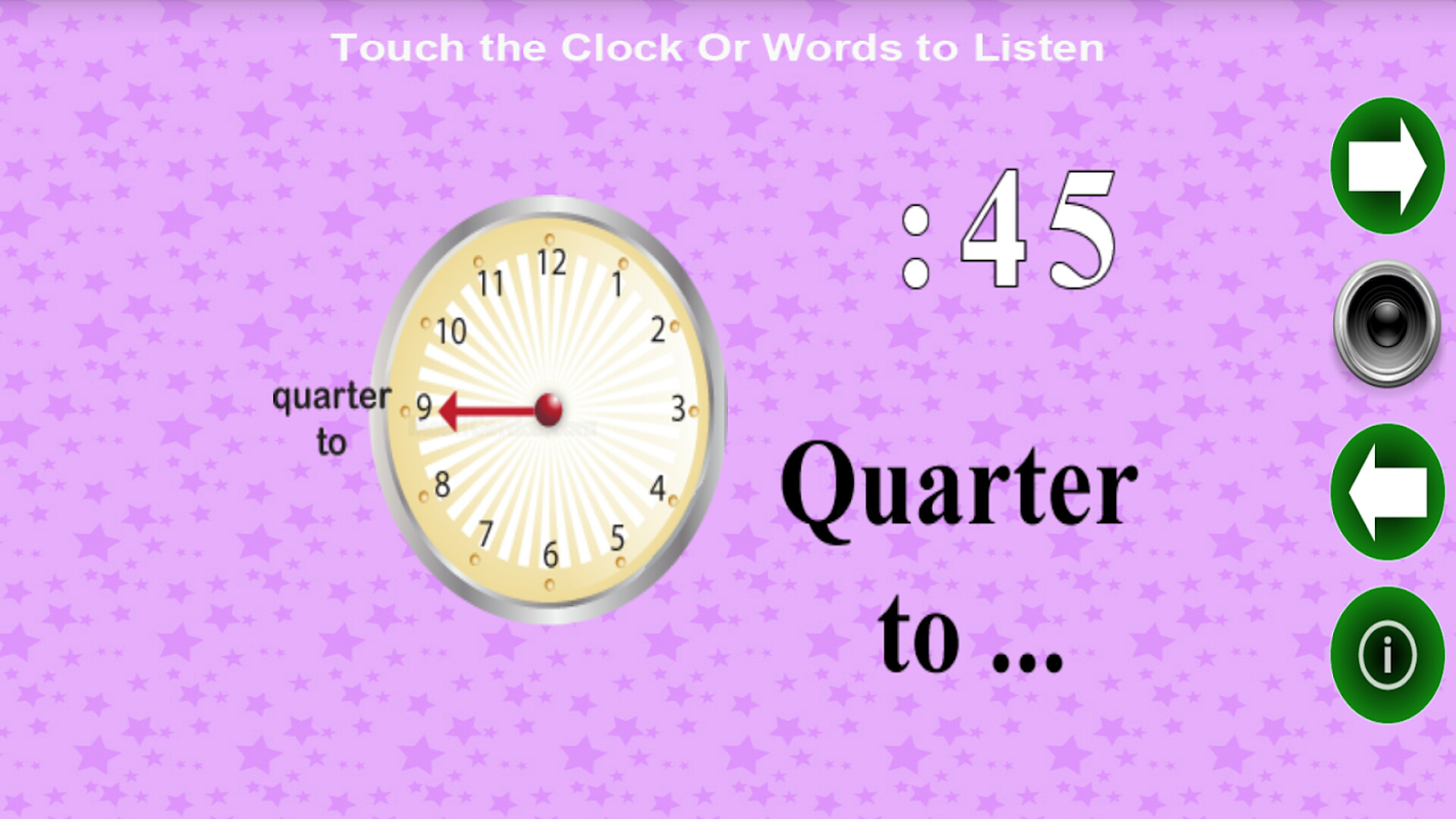 Teach yours kids how to read the clock with this application visually (pictures and sounds how to say the time in English).