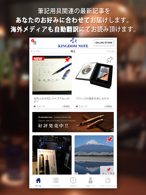 KINGDOM NOTEは、万年筆・筆記具に関する最新記事を、あなたの好みに合わせてお届け。ポイントカード機能、最新情報通知など、お買い物に役立つ機能も充実!
