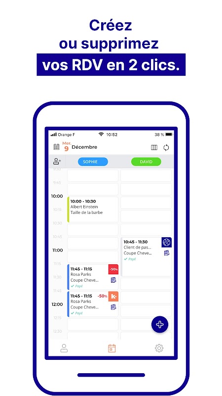 اپنی تقرریوں کا نظم کریں اور اپنے سمارٹ فون سے اپنی ساری منصوبہ بندی تک رسائی حاصل کریں۔ اپنی تقرریوں کو اپنی ضروریات کے مطابق بنائیں اور حذف کریں ، آپ کا کیلنڈر باقاعدگی سے مطابقت پذیر ہوتا ہے۔ کاغذ کے ایجنڈے پر مزید مٹاؤ نہیں! اپنے ٹائم ٹائم کا نظم کریں اور اپنی ٹیموں کی منصوبہ بندی کو اپنائیں۔ آپ اپنی سیلون میں اپنی پوری ٹیم یا ہر ملازم اور سامان کے ہر ٹکڑے کا شیڈول دیکھ سکتے ہیں۔ ہر ملاقات میں بکنگ کی معلومات براہ راست کیلنڈر میں ، متعلقہ تبصروں کے ساتھ ساتھ ادائیگی کی حیثیت (ادائیگی ، زیر التواء ، جمع ...) اور متعلقہ ٹکٹ دکھاتا ہے۔ اور یقینا you آپ ایک نظر میں دیکھ سکتے ہیں جہاں سے ہر میٹنگ آتی ہے۔ آن لائن ریزرویشن آپ کی سائٹ پر ، کییوٹ ڈاٹ ایف آر مارکیٹ پلیس پر ، گوگل کے ساتھ ریزرو ، یا سائٹ پر کوئی ملاقات؟ آپ کو اپنی بکنگ کی اصلیت سے متعلق تمام معلومات ہیں۔