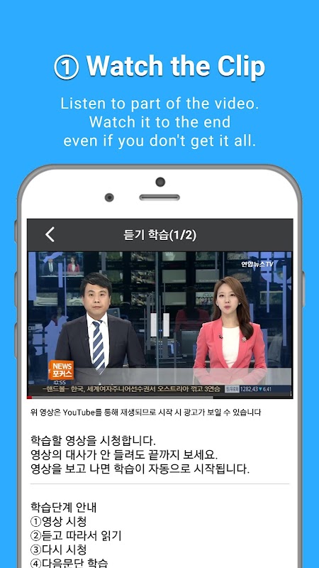 2) Listen - In listen mode, you watch the video clip first. Watch it to the end even if you don't get it all. Then, listen and repeat what you heard. Finally, watch the video clip again. If you repeated what you heard, you can hear it more clearly.