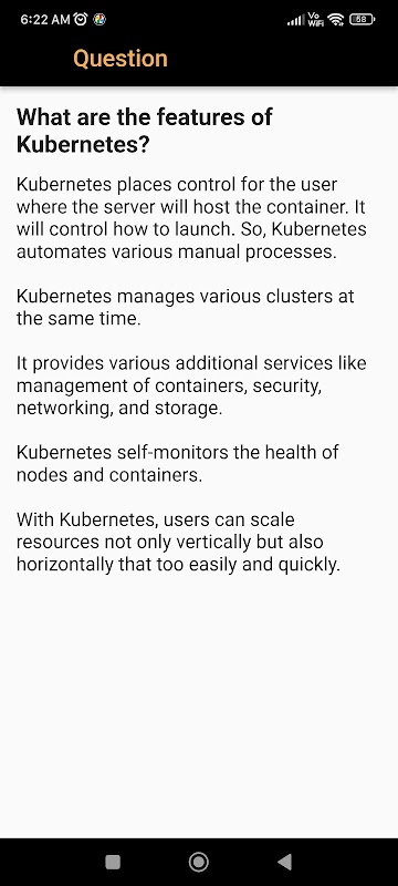 Kubernetes کے انٹرویو کے سوالات: Kubernetes میں خاص طور پر دلچسپی رکھنے والوں کے لیے، ہماری ایپ میں Kubernetes کے تصورات پر مرکوز 100+ سے زیادہ سوالات کے ساتھ ایک وقف شدہ سیکشن شامل ہے۔ اپنے علم کو گہرا کریں اور Kubernetes انٹرویو کے منظرنامےKubernetes میں اپنے اعتماد کو فروغ دیں۔