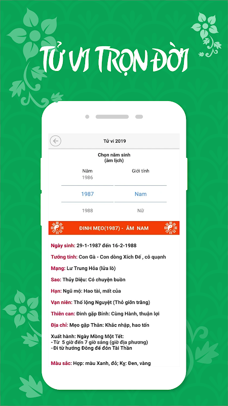 Lịch vạn niên 2020 sẽ đem đến cho bạn những thông tin cập nhật,đầy đủ và chính xác nhất. Trong phần tử vi của ứng dụng LICH VAN NIEN 2020 bạn có thể khám phá như tính năng