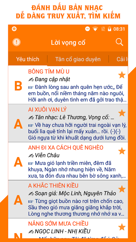 Ứng dụng tra tra cứu lời bài hát vọng cổ, cải lương, ca cảnh, điệu lý...