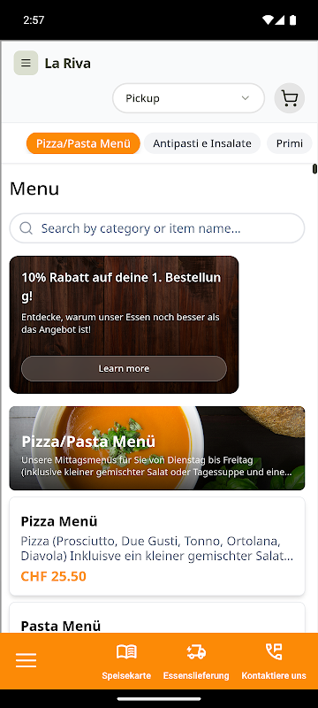 Willkommen bei La Riva! Unsere einzigartigen Geschmacksrichtungen werden Sie begeistern. Als Teil des Sparissimo-Netzwerks bieten wir exclusive Deals und Promotionen an. Bestellen Sie jetzt und verdienen Sie Cashback bei jeder Bestellung. Besuchen Sie unsere Website unter lariva.sparissimofood.com und entdecken Sie unsere vielfältigen Menüoptionen. Ob Sie nach einem romantischen Abendessen zu zweit oder einer geselligen Feier mit Freunden suchen، bei La Riva sind Sie genau richtig. Wir freuen uns darauf, Sie bei uns begrüßen zu Dürfen!