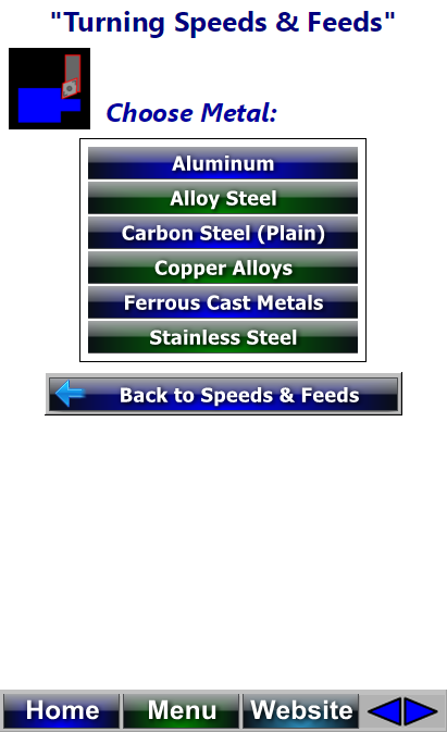 Web Machinist has many calculators for CNC Machinists, Programmers and QC Inspectors. Including Calculators for Angles, CNC Applications, CNC Lathe Fanuc Canned Cycles including G76 Thread Cycle Calculators, Simple Lathe Cam CNC Lathe Tool Nose Compensation G-Code Calculators, Chamfer G-Code Calculators, Metric Conversions, Countersink Depth Calculators, Center Drill Depth Calculators, General Conversions, CNC Drilling, CNC Mill & Lathe Deep Hole Drilling calculators, Dovetail Measuring Calculators, Blueprint Symbols, G Codes, M Codes, Machining Formulas and calculators, Spindle speed and feed rate formulas and calculators, circle solving formulas, Hole Patterns, Hole Array Patters including full circle and partial circle patterns, 3 Wire Threads Pitch Diameter Measuring Calculators for Unified Threads, Metric Threads, Acme Threads and Metric Trapezoidal Threads, CNC Lathe Tool Nose Radius compensation calculators, QC Inspection, Manual Machining, Metal Removal Rates, CNC Milling, Reference, Rotary Axis, Speeds & Feeds, Imperial and Module Spur Gear Dimensions Calculators, CNC Tapping, CNC Threading, Manual Lathe Calculators, Unified Threads, Metric Threads, Acme Threads, Metric Trapezoidal Threads, Spur Gears, Module Spur Gears, Imperial Spur Gears, Area Calculators, Triangles, Circle Calculators, Mill Machine Tooling, Collets dimensions, Keyseat Cutters Calculators, Trigonometry Calculators, Hole Pattern Calculators, Wheel Bolt Pattern Calculators, Manual Mill Calculators, Tooling & Hardware, Sine Bar and Compound Sine Plate calculators, Trigonometry & Geometry, Shop Math Calculators, Lathe Spindle Speed Calculators, CNC Tapping Speeds Calculators, Surface Roughness Calculators, Drilling Speeds Calculators, Tapping Speeds Calculators, CNC Turning and Miscellaneous Calculators. This is a Must Have Program for Machinists, CNC Machinists, Machine Shops, QC Inspectors, CNC Set-up Operators, CNC Programmers.