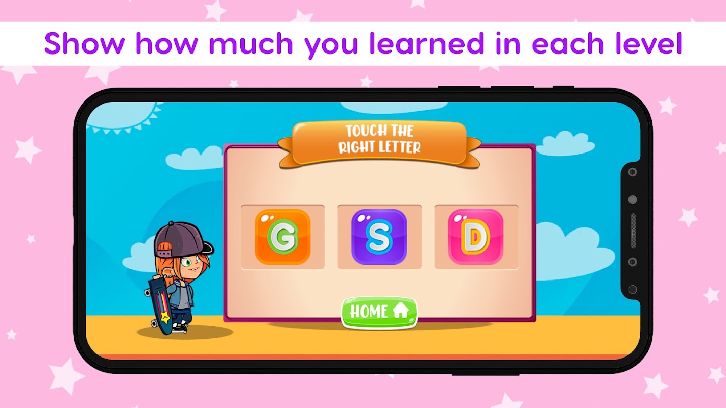 ہر سطح کے اختتام پر، آپ کو ایک چھوٹا سا ٹیسٹ ملے گا، جہاں بچے اپنے سیکھے ہوئے حروف تہجی کے حرف کی شناخت کرکے جو انہوں نے پہلے منتخب کیا تھا، اسے عملی جامہ پہنائیں گے۔ جیسا کہ آپ دیکھ سکتے ہیں، یہ بچوں کے لیے abc حروف تہجی سیکھنے کا بہترین کھیل ہے۔