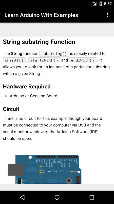 Learn Arduino With Examples app teaches you basic concepts about Arduino using suitable examples. Arduino consists of both a physical programmable circuit board as well as a software, or IDE (Integrated Development Environment) that runs on your computer, which can be used to write & upload computer code to the physical board.