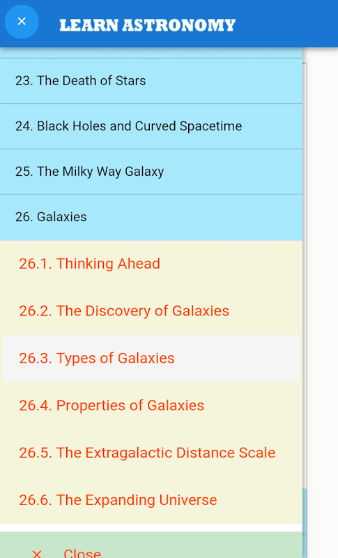 The app, Learn Astronomy, contains a Digital Textbook with content such as: