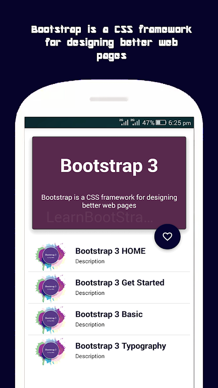 Bootstrap is the most popular HTML, CSS, and JavaScript framework for developing responsive websites.In this app you will learn about Bootstrap 3 with the help of syntax code.And also this bootstrap tutorial app contains many of bootstrap code examples which give you the clear idea that how to create a bootstrap page.