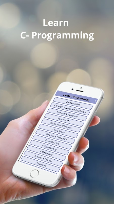 Learn C Programming & Tutorial app covers all the basic concepts such as Program Syntax, Data types, Variables, Constants, Keyword, Identifiers, Operators, Decision Making, Loops, Arrays, String, Structure, Union, Pre-processors and so on.