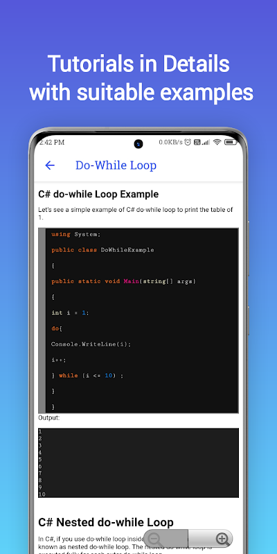 سیکھیں سی # ایک مفت ایپ ہے جو سی # کو سیکھنا اور اس کے اصلی وقت کے منصوبوں کو آزمانا آسان بناتا ہے۔ آپ ایپ کو سی # ٹیوٹوریلز مرحلہ وار استعمال کرسکتے ہیں ، سی # مترجم کا استعمال کرتے ہوئے ہر اسباق پر کوڈ کے ساتھ تجربہ کرتے ہیں اور C # کے بنیادی تصور کو ابتداء سے لے کر اعلی درجے کی سطح تک جان سکتے ہیں۔