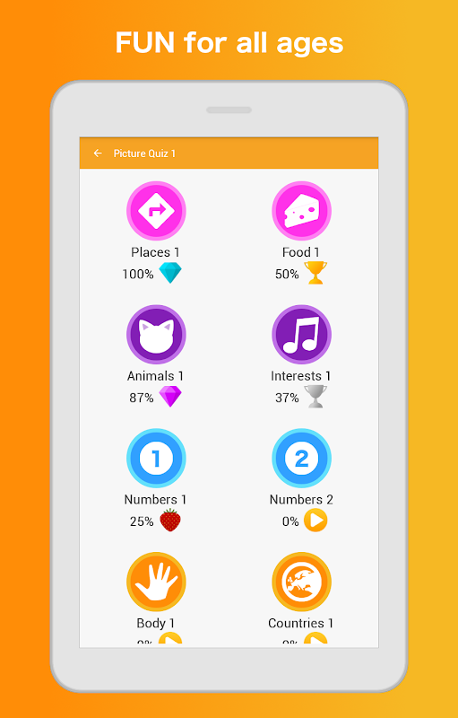 Phrasebook sets include: greetings, numbers, hobbies, accommodation, adjectives, animals, body, colors, clothing, countries, directions, emergencies, food, school, shopping, transportation, travel, verbs, weather and work.