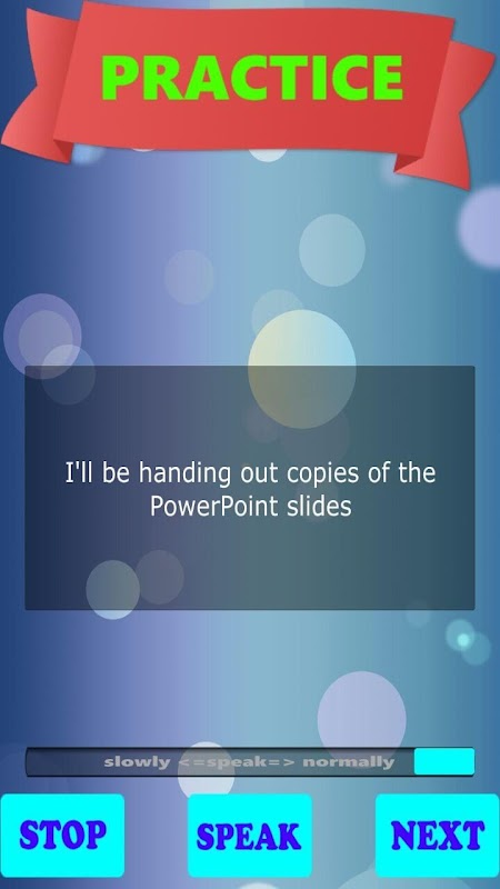 نمایاں طور پر تقریر آپ کو کسی بھی الفاظ (تلفظ) اور جملے کے ذریعہ آپ بولنے کے مشق کرنے کی اجازت دے گی۔ صرف اپنی اپنی لغت یا جملے ٹائپ کریں یا پیسٹ کریں اور ایپلی کیشن کو ان کو صحیح طور پر بولنے میں مدد دیں۔