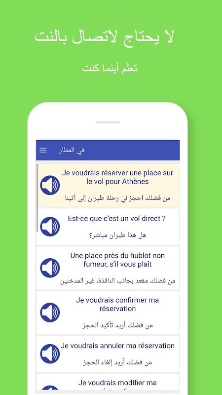 تطبيق تعلم اللغة الفرنسية بالصوت تطبيق شامل يحتوي على عدة أقسام ومحادثات بالصوت.