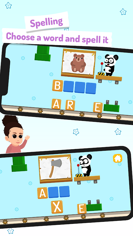 مزید برآں، اس اے بی سی لرننگ ایپ میں کئی ہجے والی گیمز شامل ہیں جو بچوں کو سادہ ہجے سے متعارف کرواتی ہیں، ایک لفظ مکمل کرتی ہیں اور ایک نیا انلاک کرتی ہیں۔ حروف سیکھیں انٹرایکٹو چھپے ہوئے ماحول اور مضحکہ خیز پانڈا کرداروں سے بھرے ہوئے ہیں جو بچوں کے تجسس کو بھڑکانے کے لیے ڈیزائن کیے گئے ہیں۔