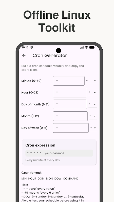 • Offline tools: Chmod Calculator and Cron Generator—no internet needed