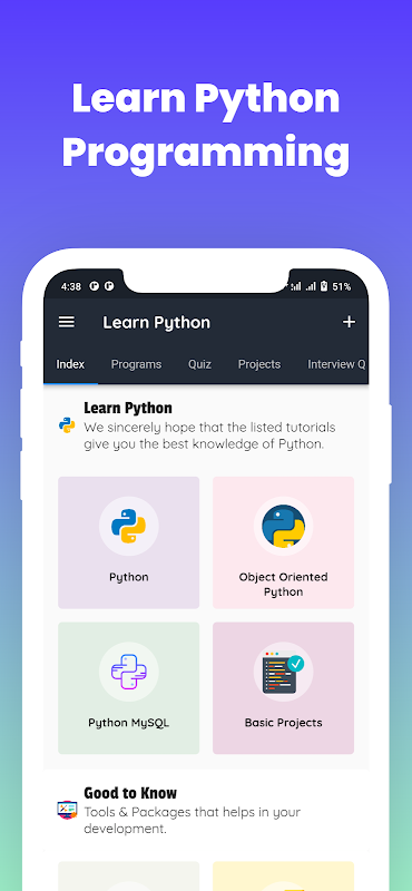ہر کوڈنگ سیکھنے والوں یا کمپیوٹر سائنس سائنس طلباء کے لئے جب چاہے جہاں چاہیں اور جہاں بھی چاہیں ازگر کی پروگرامنگ زبان سیکھنے کے ل Learn ، پائیون کو سیکھنا ضروری ہے۔ چاہے آپ ازگر کے انٹرویو کی تیاری کر رہے ہو یا کسی ایسے امتحان کے لئے جس میں ازگر کے پروگرامنگ کے علم کی ضرورت ہو ، آپ اس پروگرامنگ لرننگ ایپ پر حیرت انگیز مواد تلاش کرسکتے ہیں۔