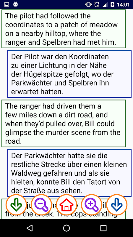 Expand your vocabulary, while reading in your home language and the language you want to learn. For easier reading on the mobile screen few sentences in your language are followed with a few sentences in another language and so on. If the sentences get unaligned, you can realign them with the blue and green down arrows at the bottom, that move all blue/green fields one step down.You can click on any word to translate it in any language with your online dictionary.