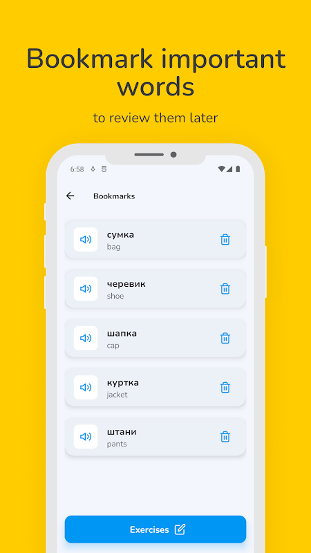 ایپ میں 3000 سے زیادہ عام الفاظ شامل ہیں جنہیں مشکل کے مطابق ترتیب دیا گیا ہے۔ ہر سطح میں آپ کو نئے الفاظ حفظ کرنے میں مدد کرنے کے لیے انٹرایکٹو مشقیں ہوتی ہیں۔ اگر آپ کو کچھ مشقیں پسند نہیں ہیں، تو آپ انہیں سیٹنگز میں بند کر سکتے ہیں۔ اگر آپ کو کچھ الفاظ یاد نہیں ہیں تو بس انہیں اپنے بُک مارکس میں شامل کریں تاکہ آپ بعد میں ان کا جائزہ لے سکیں اور ان پر عمل کر سکیں۔