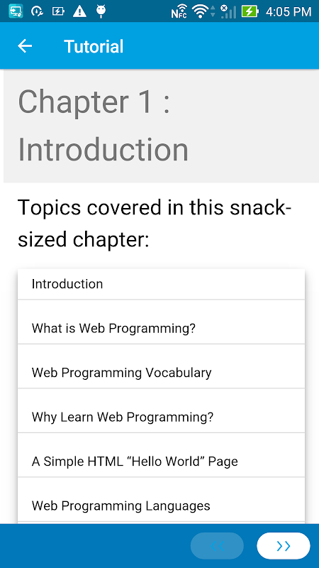 You have limited access to the content provided. For full access to the content, please login and purchase this application. This app provides a quick summary of essential concepts in Web Programming by following snack sized chapters: