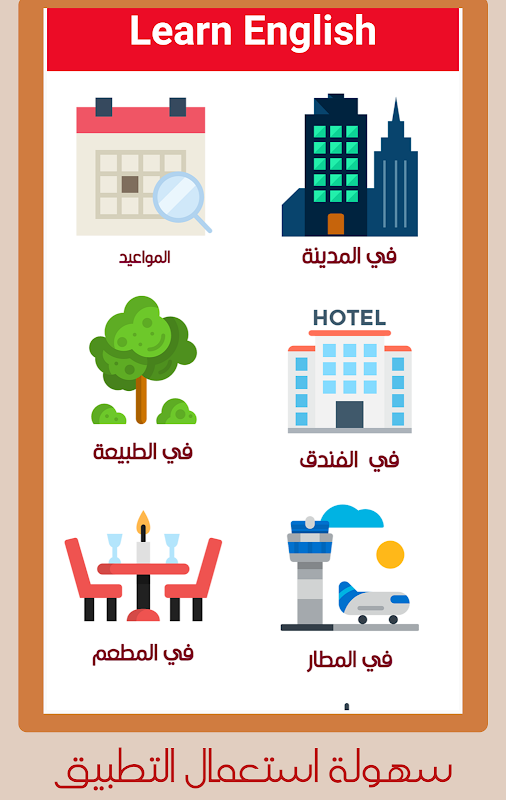 Start Learning Speaking English today Easily With this Beautiful application will be able to learn English from scratch even professionalism by learning a set of words and phrases that we use in our daily lives.
