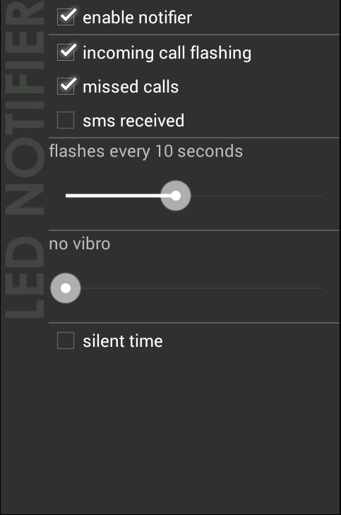 LED from the camera of your phone will alert you of incoming calls, missed calls, received SMS. You can also set up notifications via vibration. Notifications stop as soon as the screen is unlocked. You can configure the silent time, during which the program will not bother you.