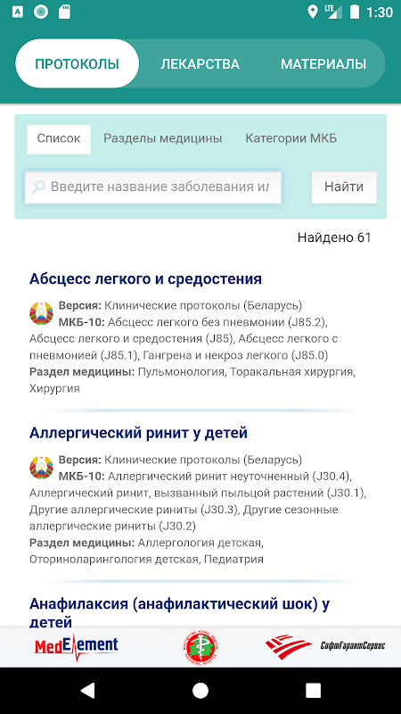 - Быстро найти нужный клинический протокол: по названию, коду МКБ, году одобрения, разделу медицины